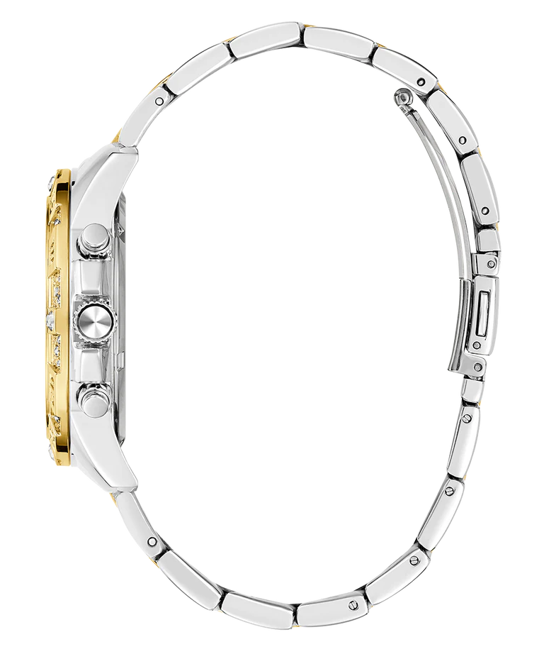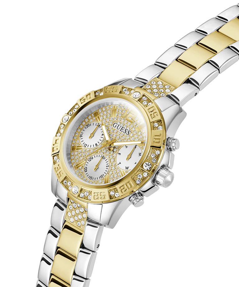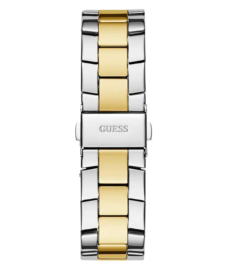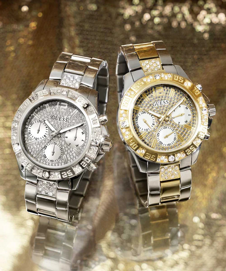 A must-have timepiece for all the watch aficionados, this women analog watch from Guess will be a perfect pick. It is stainless steel strap vaunts a multi hue that enhances the look of the watch. The gold round dial is protected by a mineral glass. It has a crown for time adjustment. Furthermore, it is complemented with a fold-over clasp with double push button safety clasp that ensures a secure fit on the wrist.