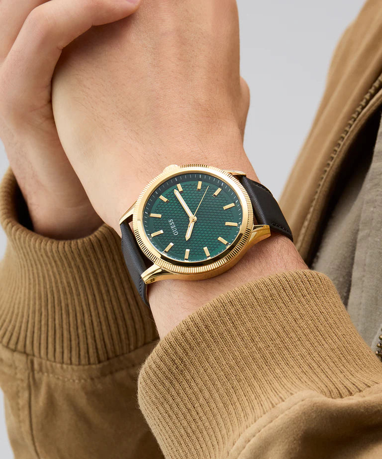 An easy go-to for any guy's wardrobe is this sophisticated dress watch featuring a refined textured pattern on the bezel as well as on its dial.
