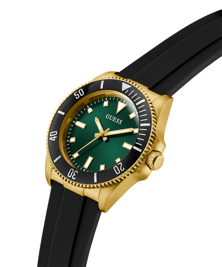 This dynamic sport timepiece features innovative aluminum details and bold contemporary design, showcasing a 41 mm round case in brushed and polished gold tone recycled steel with a distinctive black aluminum top ring paired with a black sculpted silicone strap. The green sunray dial provides a classic color contrast while the black aluminum accent adds an element of sophistication. Offering 50 meters water resistance, this eye-catching timepiece is perfect for the man who wants to make a statement with innovative materials and classic color combinations.