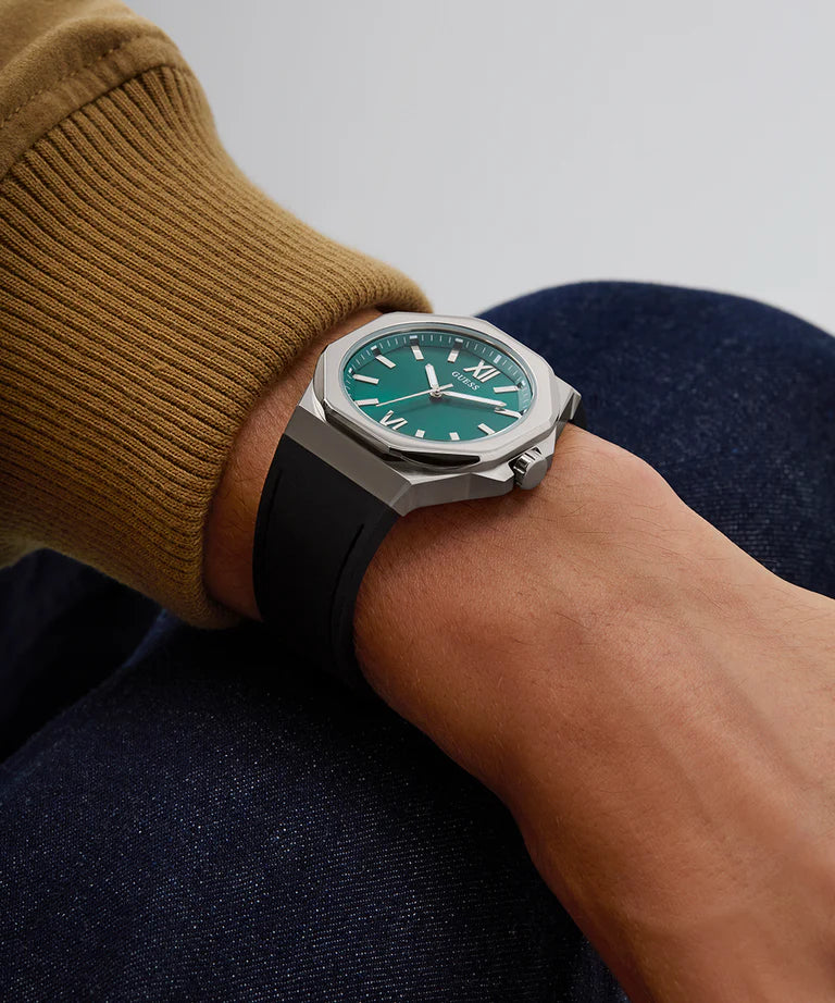 A classic dress look that is sure to elevate his watch wardrobe, this style features an octagonal case shape paired with a smooth silicone strap