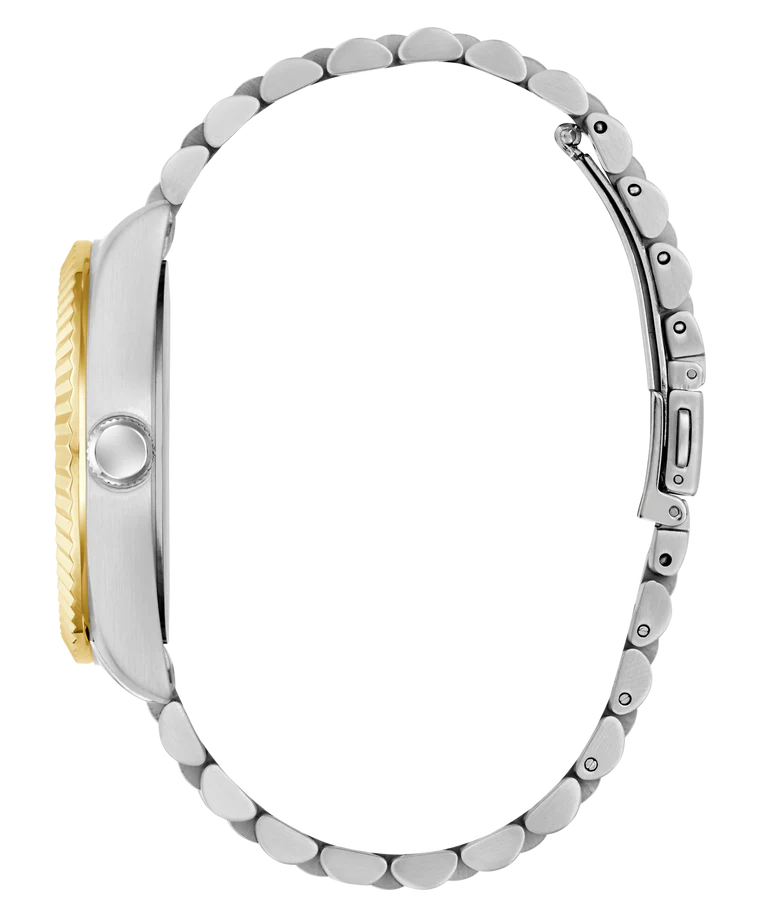This fresh, sleek dress look delivers timeless sophistication! Featuring a 42 mm two-tone silver and gold tone brushed and polished recycled steel case with a jubilee style bracelet. The green sunray dial features a date window and 24-hour movement sub dial and is framed by a distinctive coin edge bezel that ties together this beautiful timepiece. Built with mineral lens protection, precise quartz analog movement, and 50 meters water resistance, this versatile watch is perfect for the man who demands both style and substance in his timepiece collection.