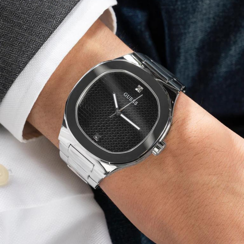 This headliner is sure to steal the show, it has a unique rounded square case design with screw details and a textured dial with genuine diamond marker at the 12 o'clock hour.