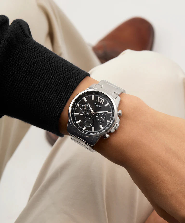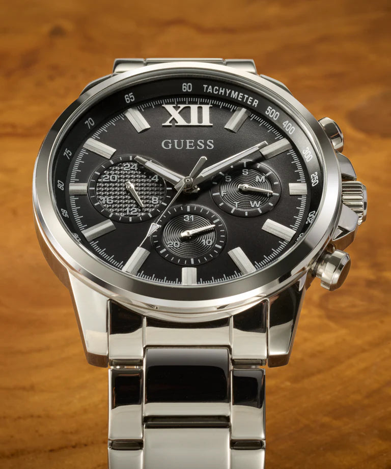 The Guess Walker GW0900G1 men's watch is a stylish model that combines modern design with a classic form. It has a quartz movement that ensures its operation. The 44 mm wide silver-colored envelope is made of stainless steel. The black-colored dial is covered with mineral glass, and the silver-tone stainless steel bracelet forms a harmonious whole. The watch features a water resistance of up to 50 meters.
