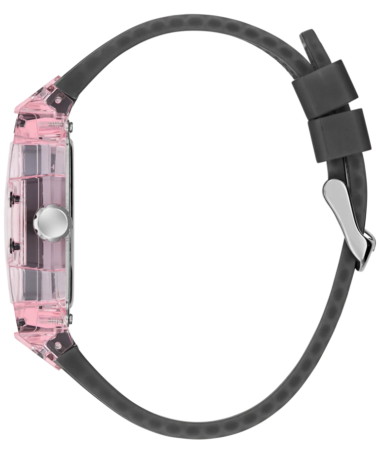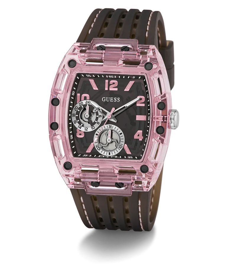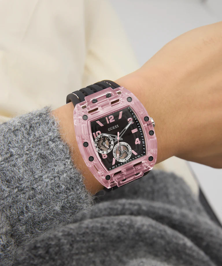This 43 mm x 42 mm watch makes a powerful statement with its transparent black multi-function dial housed in a cutting-edge cut-thru transparent light pink polycarbonate case - a signature icon for GUESS Watches. The milky black transparent silicone strap with perforation and pop pink stitching delivers athletic style with purpose, featuring 50 meters water resistance. Bold, athletic, and driven by purpose.