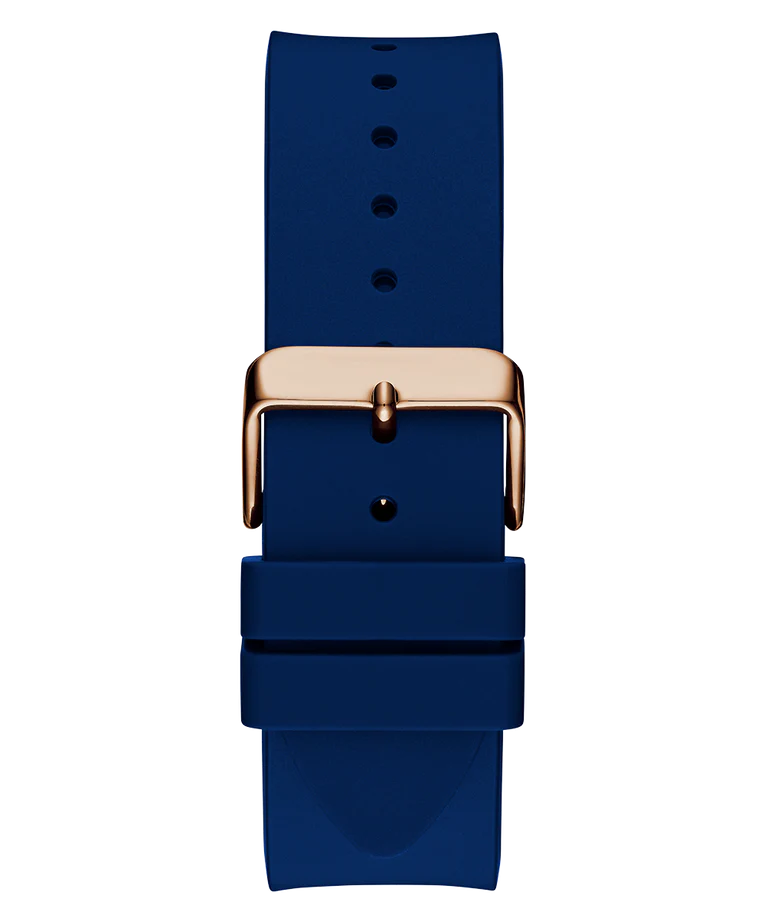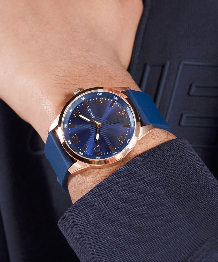Add a stylish dimension to your look by wearing this men analog watch from Guess. Covered by a mineral glass, the blue round dial. It has a crown for time adjustment. The silicon strap exudes a blue hue that accentuates the look of the timepiece. Moreover, it is fitted with a buckle clasp that ensures a secure fit on the wrist.