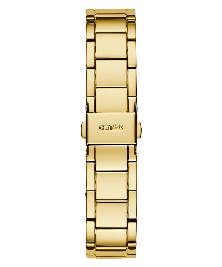 Reflecting the dynamism of modern lifestyles, this women analog watch from Guess will be a great addition to your collection of watches. Secured by a mineral glass, the gold round dial. It has a crown for time adjustment. The stainless steel strap comes in a gold hue that further elevates the look of the timekeeper. Moreover, it is equipped with a fold-over clasp with double push button safety clasp to ensure a secure fit on the wrist.