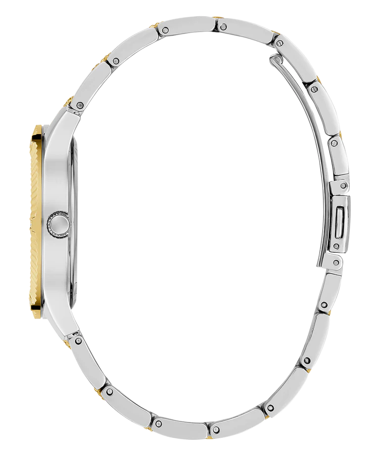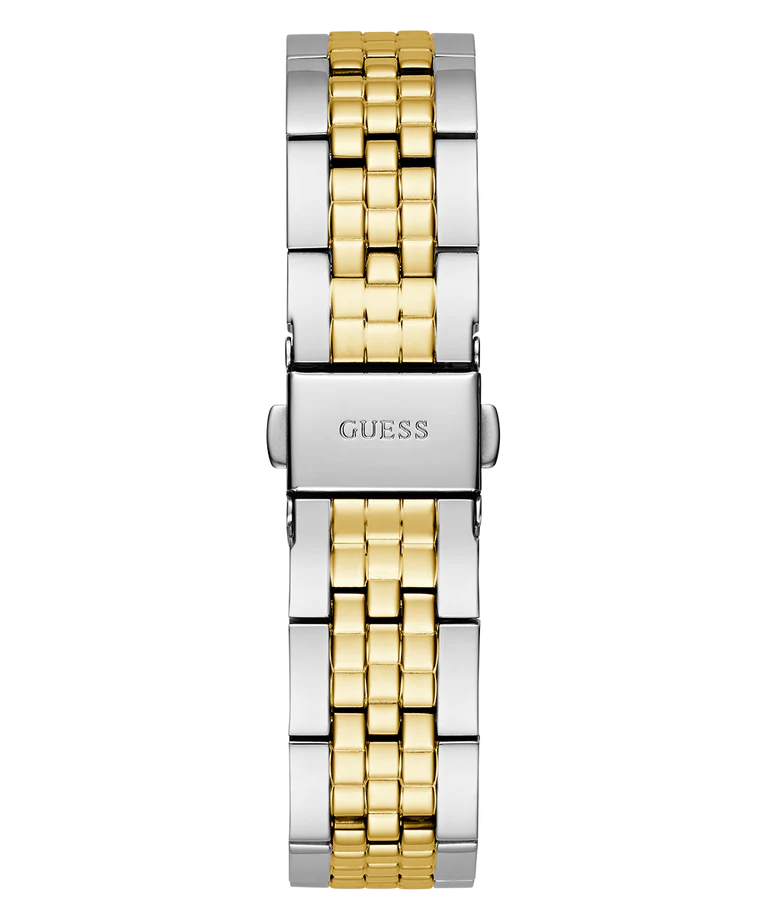 Add a stylish dimension to your look by wearing this women analog watch from Guess. Covered by a mineral glass, the silver round dial. It has a crown for time adjustment. The stainless steel strap exudes a multi hue that accentuates the look of the timepiece. Moreover, it is fitted with a fold-over clasp with double push button safety clasp that ensures a secure fit on the wrist.