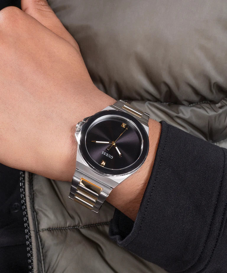 A must-have timepiece for all the watch aficionados, this men analog watch from Guess will be a perfect pick. It is stainless steel strap vaunts a multi hue that enhances the look of the watch. The black round dial is protected by a mineral glass. It has a crown for time adjustment. Furthermore, it is complemented with a fold-over clasp with double push button safety clasp that ensures a secure fit on the wrist.