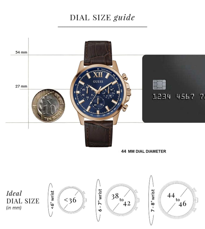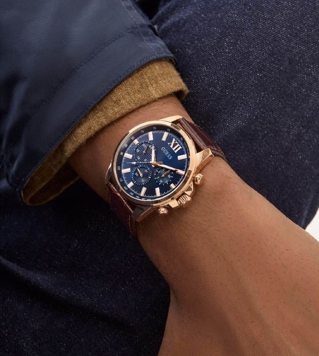 A great mix of form and functionality, this men's analog watch from the Walker collection by Guess will be a perfect pick for all watch aficionados. Enclosed in a 44 mm case, the blue round dial is secured by a mineral glass. It displays chronograph. The leather strap flaunts a brown hue that accentuates the look of the watch. Besides, it is finished with a buckle clasp that provides a secure fit on the wrist.