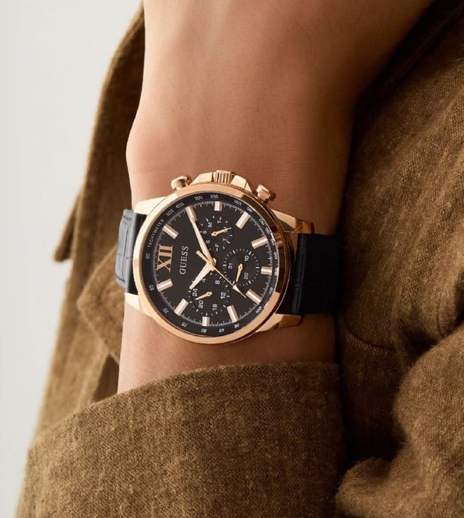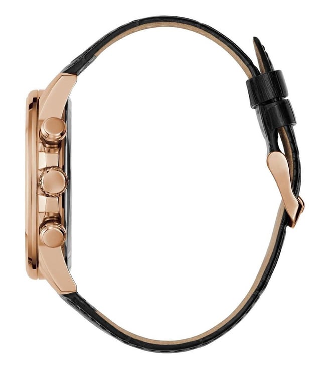Merging contemporary style with performance, this men's analog watch from the Walker collection by Guess will lend you a modish look. The black round dial is secured by a mineral glass and is encased in a 44 mm case. It exudes chronograph. The leather strap exudes a black hue that accentuates the look of the watch. Furthermore, it is completed with a buckle clasp to ensure a secure fit on the wrist.