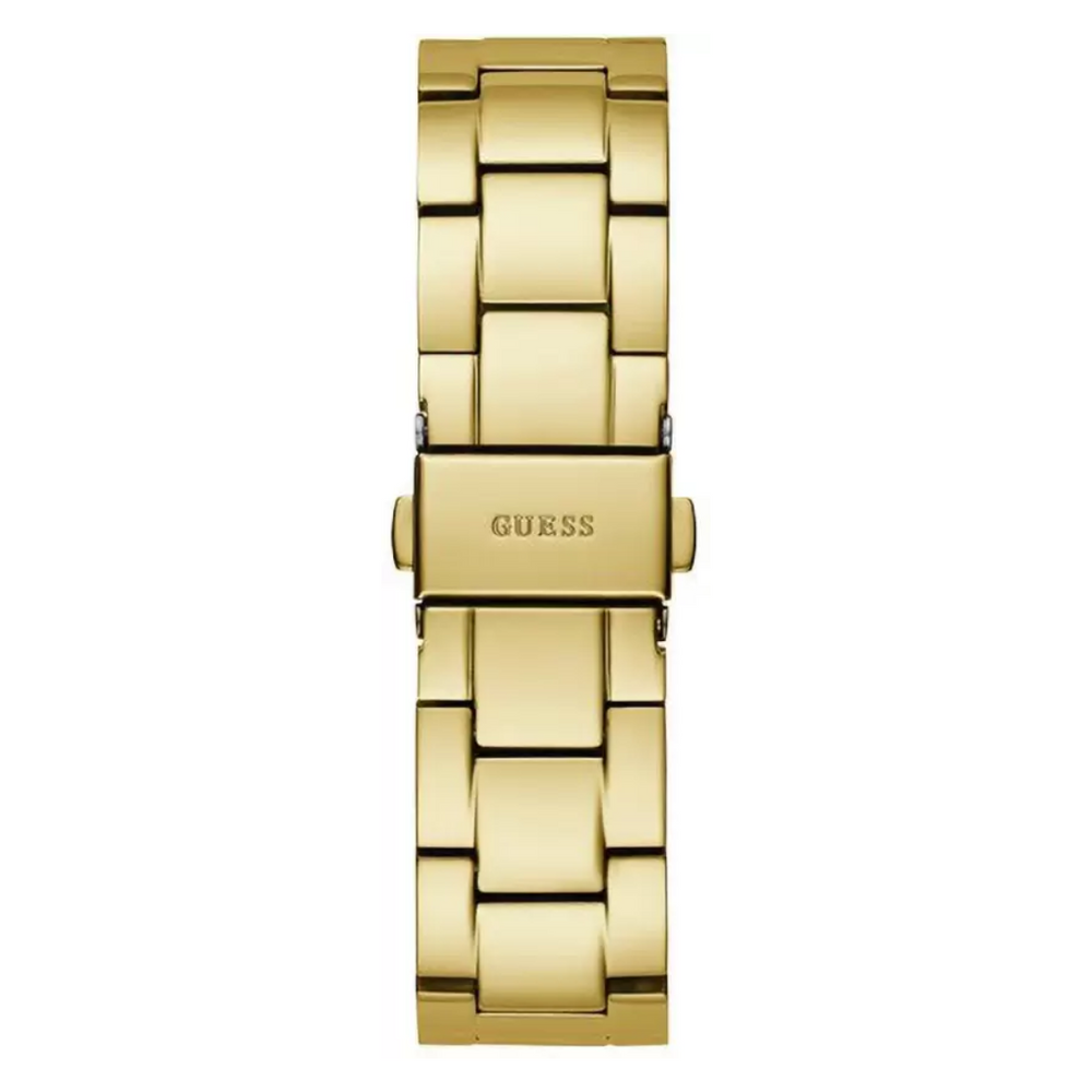 This watch is a major statement maker with its unique look. The Guess iconic triangle logo is translated into a sleek plaque as the centerpiece of this style and is paired with a three-link bracelet. The bracelet length is 190 mm, case diameter 36 mm, case thickness of 10 mm, case height 36 mm, and power source is battery.