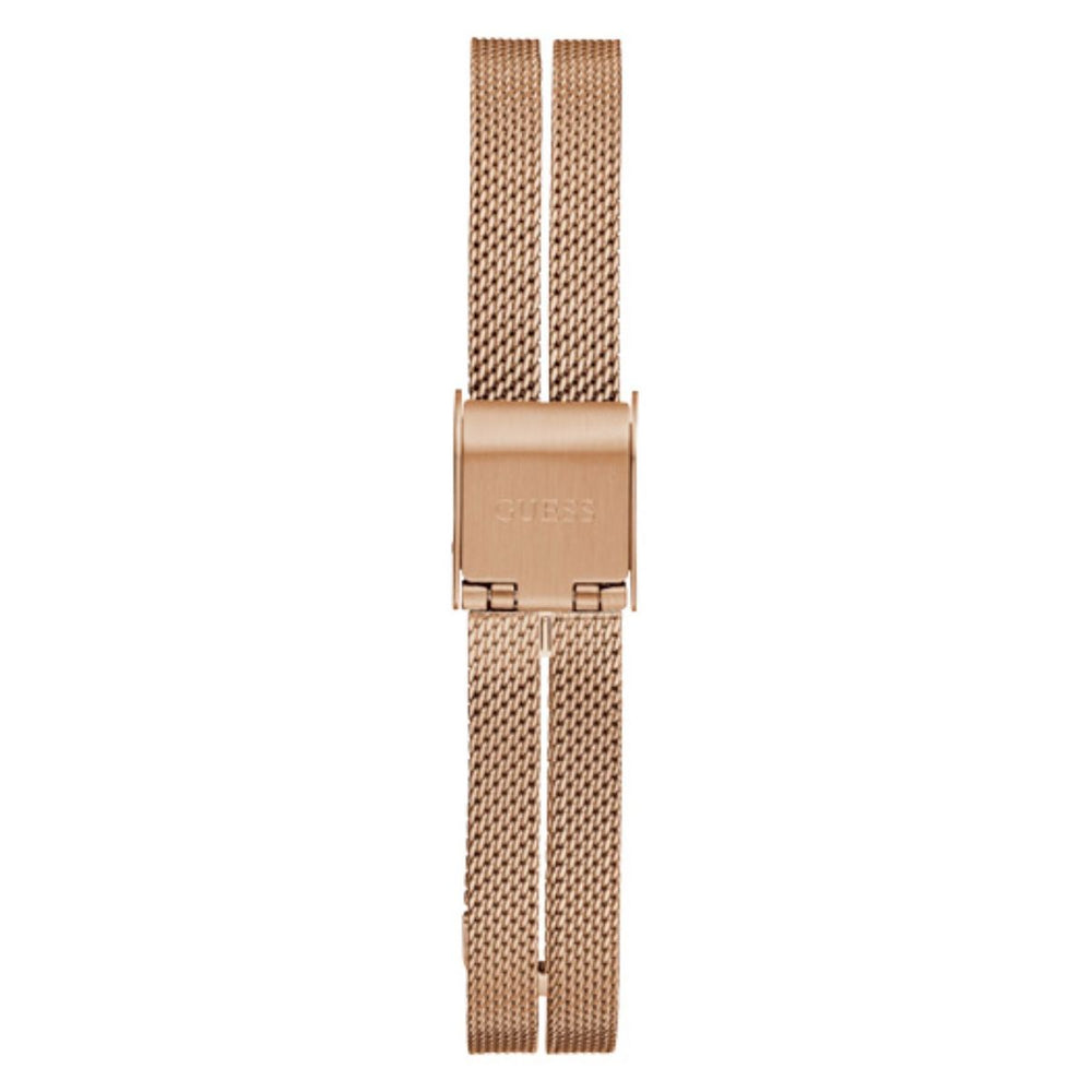 This attractive watch conveys an urban and sporty look at the same time with its transparency and color. Its unique design offers a feminine and innovative look with white dial and rose gold bracelet that emphasizes the iconic code of the brand. The strap length is 194 mm, case diameter 28 mm, case thickness of 10 mm, case height 28 mm, and power source is battery.