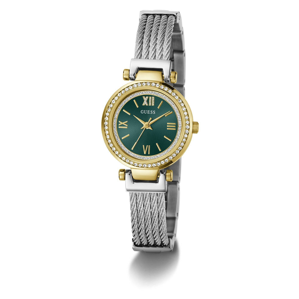 Make a refined statement with the Silver Mini Soho Green Dial Watch. This elegant timepiece features a compact round case framed with crystal embellishments and a rich green dial finished with classic Roman numeral markers. Designed with a contemporary mesh-style bracelet and powered by a precision quartz movement, it’s a timeless accessory perfect for everyday wear or elevated styling