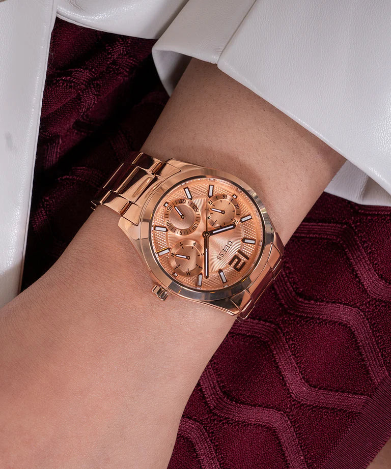 A must-have timepiece for all the watch aficionados, this women analog watch from Guess will be a perfect pick. It is stainless steel strap vaunts a brown hue that enhances the look of the watch. The rose gold round dial is protected by a mineral glass. It has a crown for time adjustment. Furthermore, it is complemented with a fold-over clasp with double push button safety clasp that ensures a secure fit on the wrist.