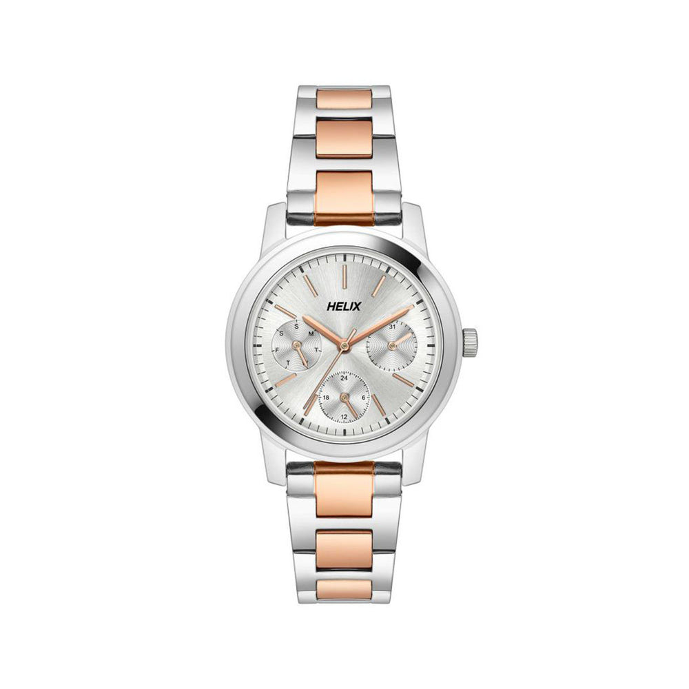 Modish and functional, this women's analog watch from the Summer Cool collection by Helix is a must-have to complement your personality. The stainless steel strap exudes a silver hue that accentuates the look of the watch. Encased in a 32 mm case, the silver round dial features plain three hands and a crown for time adjustment. Furthermore, it is completed with a push-button clasp to ensure a secure fit on the wrist.
