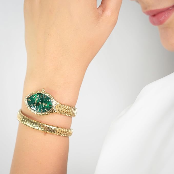 Just Cavalli watches are the ideal accessory for the fashionable woman and girl who want to add a touch of lively elegance to their casual and extravagant look, perfect for a gift and any occasion. The Just Cavalli Signature Snake is a high fashion watch that features a luxurious, modern snake design that sensually wraps around the wrist making it truly unique. Made with the highest quality and equipped with original Japanese mechanism, it is a great investment for those who love elegant watches. Women's fashion watch with oval yellow gold stainless steel case (22 mm) and mineral glass. 16 stone push-down crown, yellow gold stainless steel strap, bottle green dial. Quartz movement with analog display, ensures reliable precision and classic and elegant time reading, ideal for any occasion. Just Cavalli box colourful and elegant, exciting to open. Includes manual and warranty card. The color of the box is random.