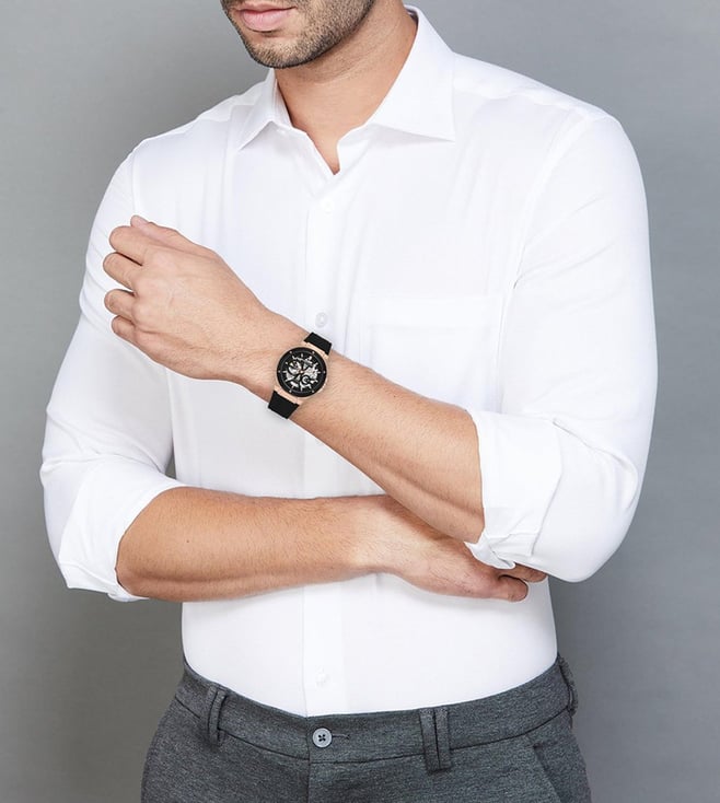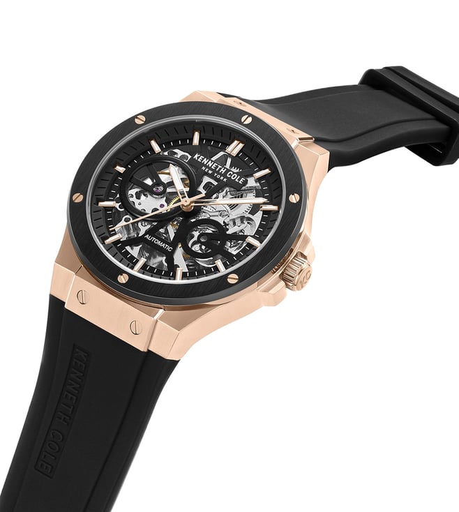 Look modish by donning this men's analog watch from the Fall collection by Kenneth Cole. Enclosed in a 43 mm case, the black round dial is secured by a sapphire glass. It displays plain three hands, DETAILS and a crown for time adjustment. The silicon strap showcases a black hue that uplifts the look of the timepiece. Besides, it is finished with a buckle clasp that provides a secure fit on the wrist.