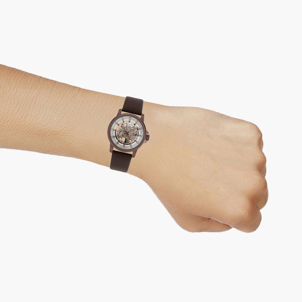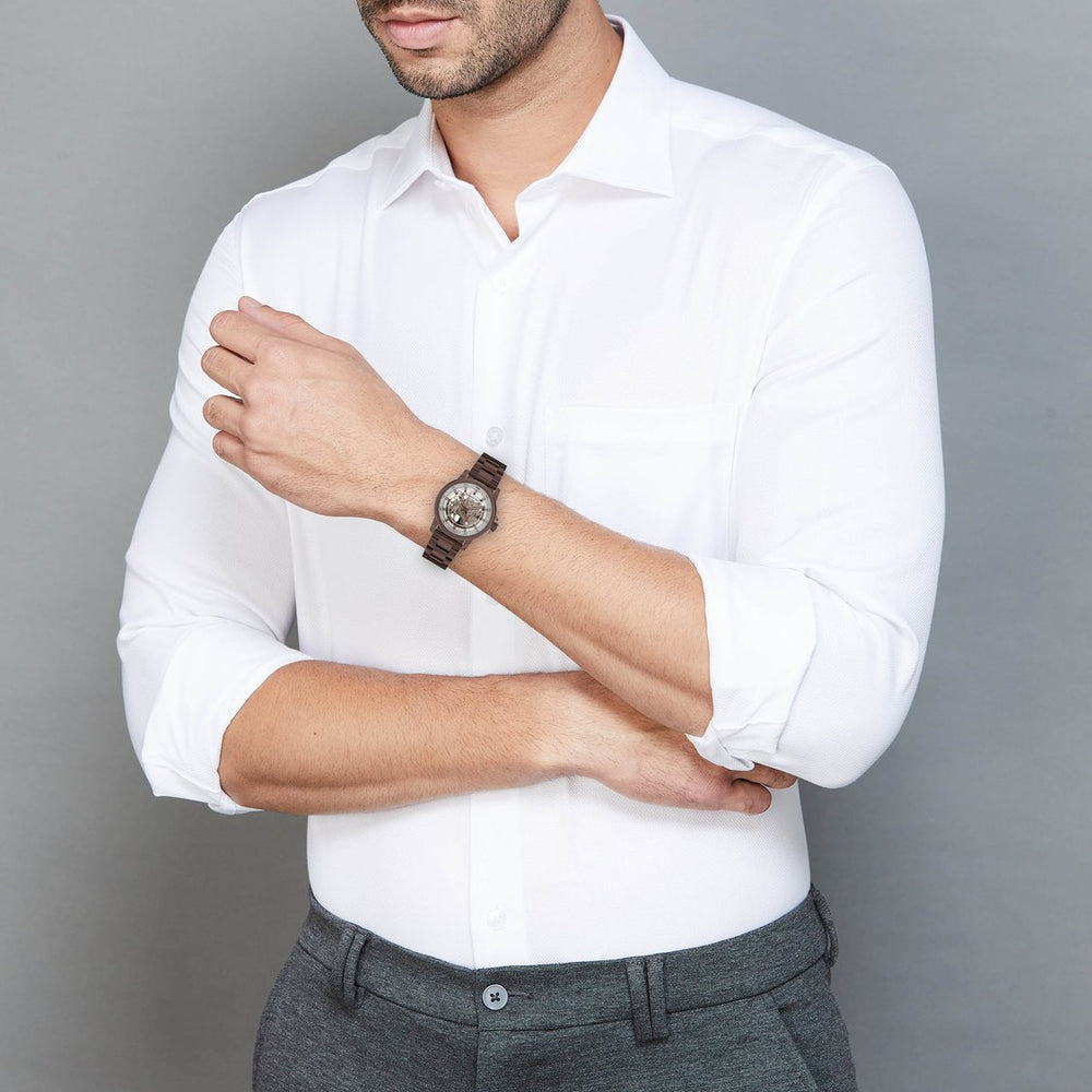 Make your presence felt with this classy 44mm automatic timepiece. This elegant timepiece boasts a skeleton dial, offering a peek into its mechanical workings with a plain 3 hands mechanism and glow-in-the-dark stick indices. With two strap options, a stainless steel bracelet or a textured leather strap, it provides interchangeability and a water résistance of 50 meters.