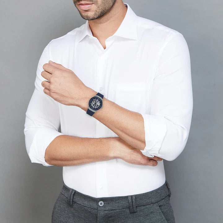 Amp up your style with this automatic watch—an absolute must-have this season! The skeleton dial adds a bold touch to the design, making it a standout accessory. Built for durability, it offers water resistance up to 30 meters and is paired with a sturdy silicone strap, secured by a tang buckle closure for a snug and secure fit. A flawless fusion of elegance and functionality!