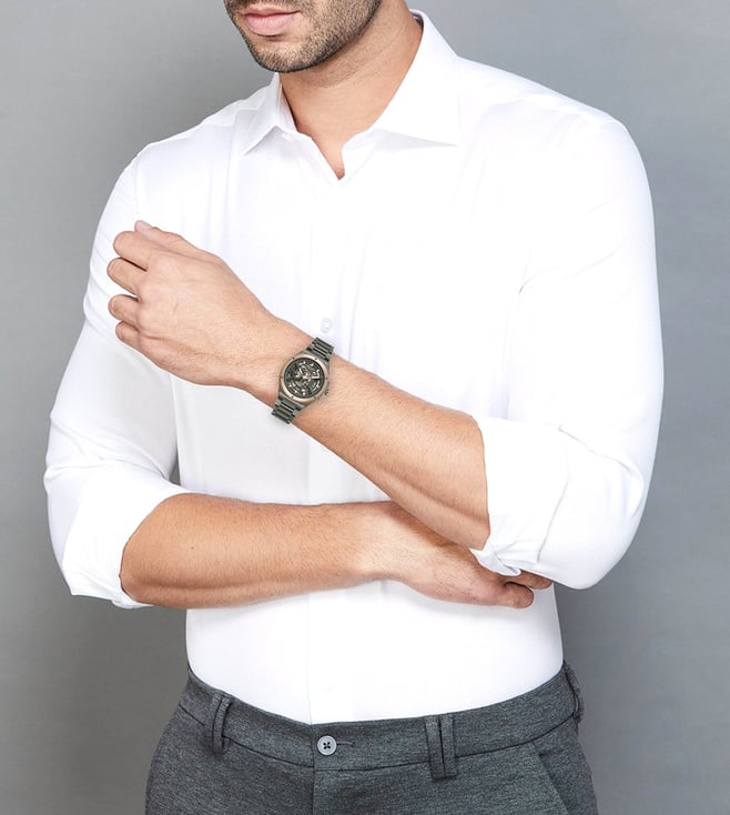 Amaze everyone around you by wearing this men's Analog watch from the collection by KENNETH COLE. The grey round dial is protected by a Sapphire Glass. It features a crown for time adjustment. The stainless steel strap comes in a grey hue that further elevates the look of the timekeeper. Besides, it is completed with a push button clasp to ensure a secure fit on the wrist.