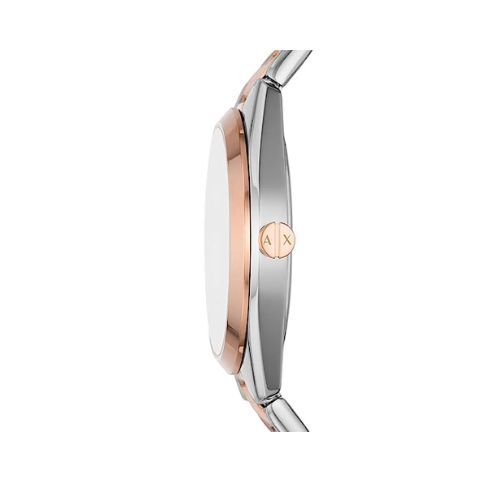 Amaze everyone around you by wearing this women's analog watch from Armani Exchange. The silver round dial is protected by a mineral glass. It features multifunction, and a crown for time adjustment. The strap comes in a silver and rose gold hue that further elevates the look of the timekeeper. Besides, it is completed with a push button clasp clasp to ensure a secure fit on the wrist.