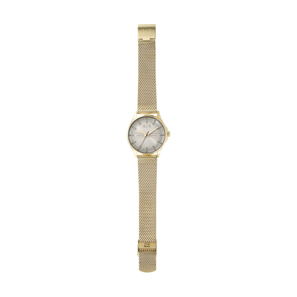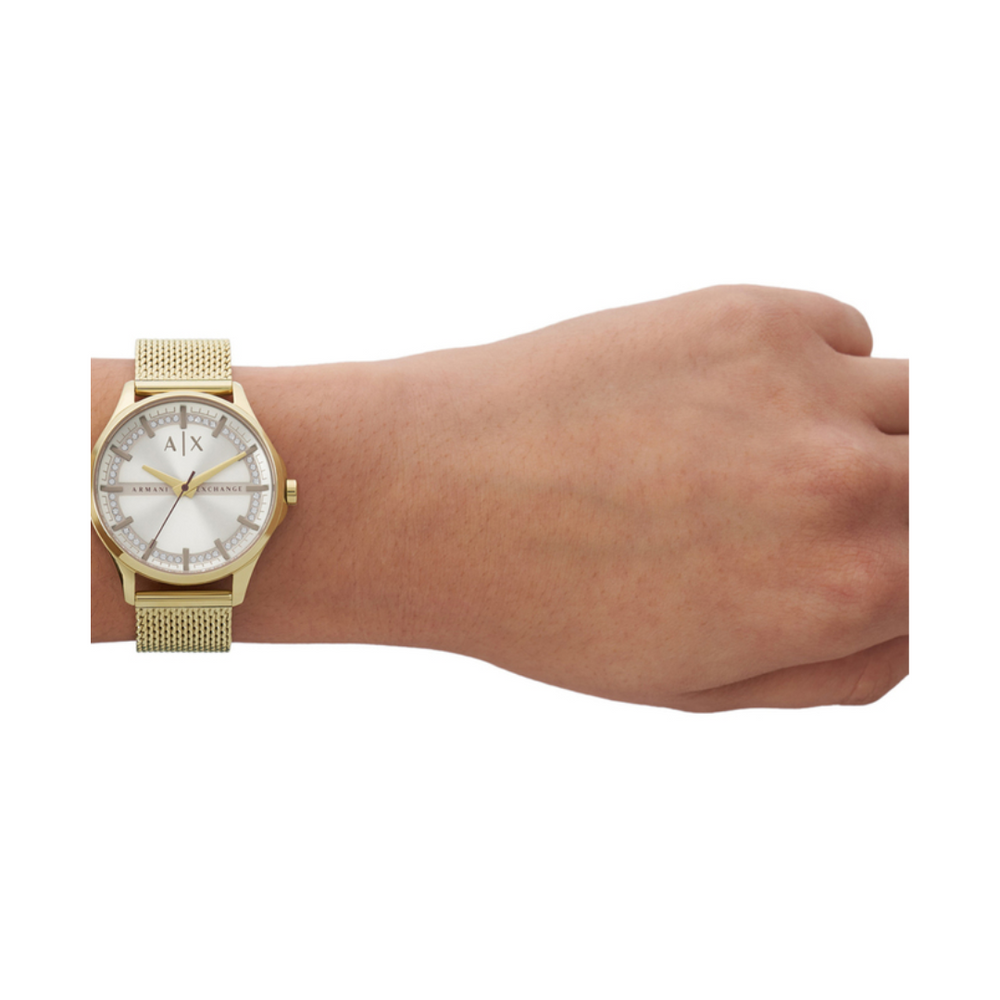 Add smartness to your personality by wearing this women's analog watch from Armani Exchange. The grey round dial is protected by a mineral glass. It has a crown for time adjustment. The stainless steel strap comes in a gold hue that further elevates the look of the timekeeper. Armani Exchange's 36mm watch features a beige brushed sunray dial, three-hand movement and gold-tone stainless steel mesh strap.