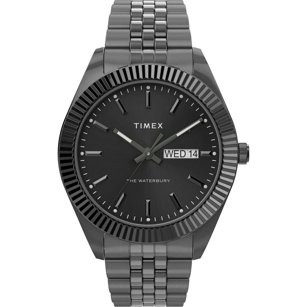 There?s strength in tradition. We?re honoring our 1854 roots as the Waterbury Clock Company and our original watchmakers with timeless, sophisticated style. A testament to our commitment to craftsmanship and our heritage, this 41mm watch with its black stainless steel case and bracelet, black dial and a refined fluted black stainless steel bezel is well-suited for everyday wear.