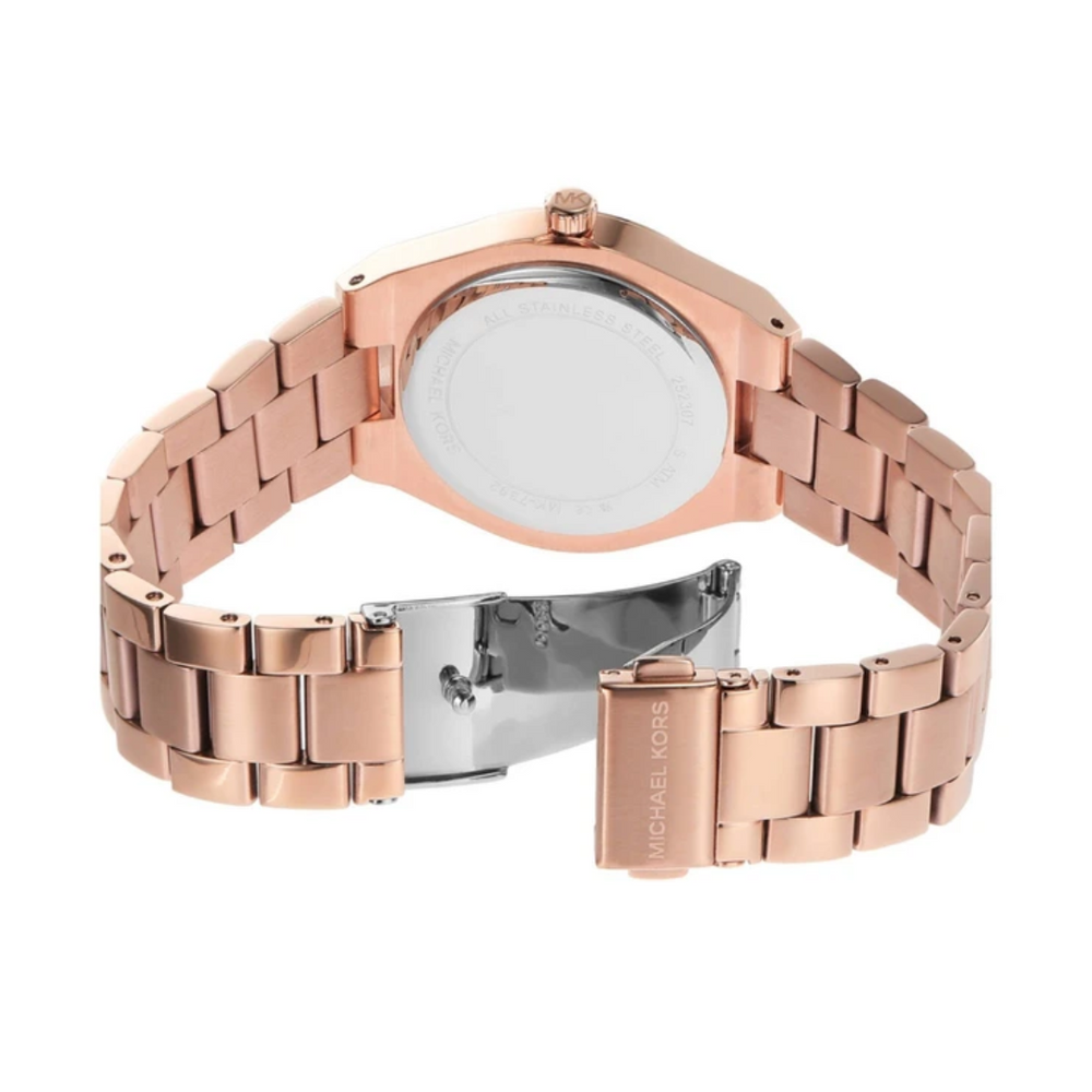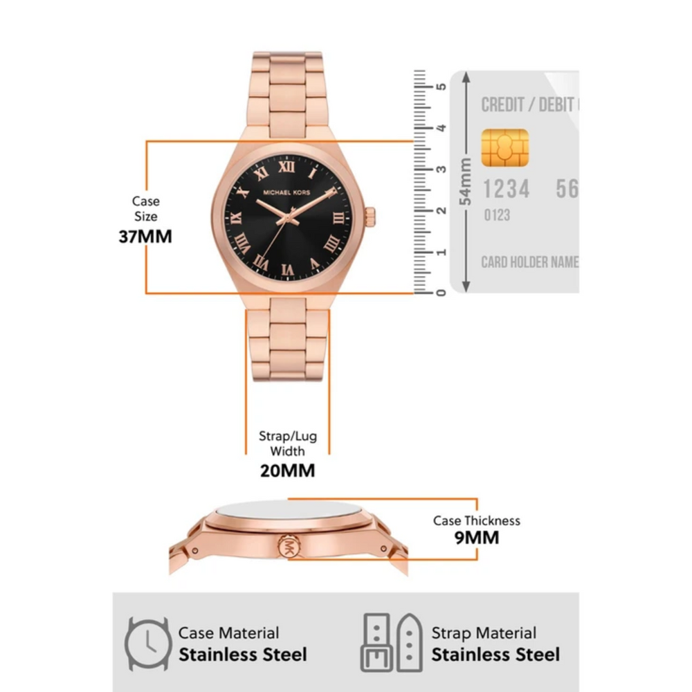 A must-have timepiece for all the watch aficionados, this women's analog watch from Michael Kors will be a perfect pick. The black round dial is protected by a mineral glass. It has a crown for time adjustment. The stainless steel strap comes in a rose gold hue that further elevates the look of the timekeeper. Besides, it is completed with a double locking fold-over clasp to ensure a secure fit on the wrist.