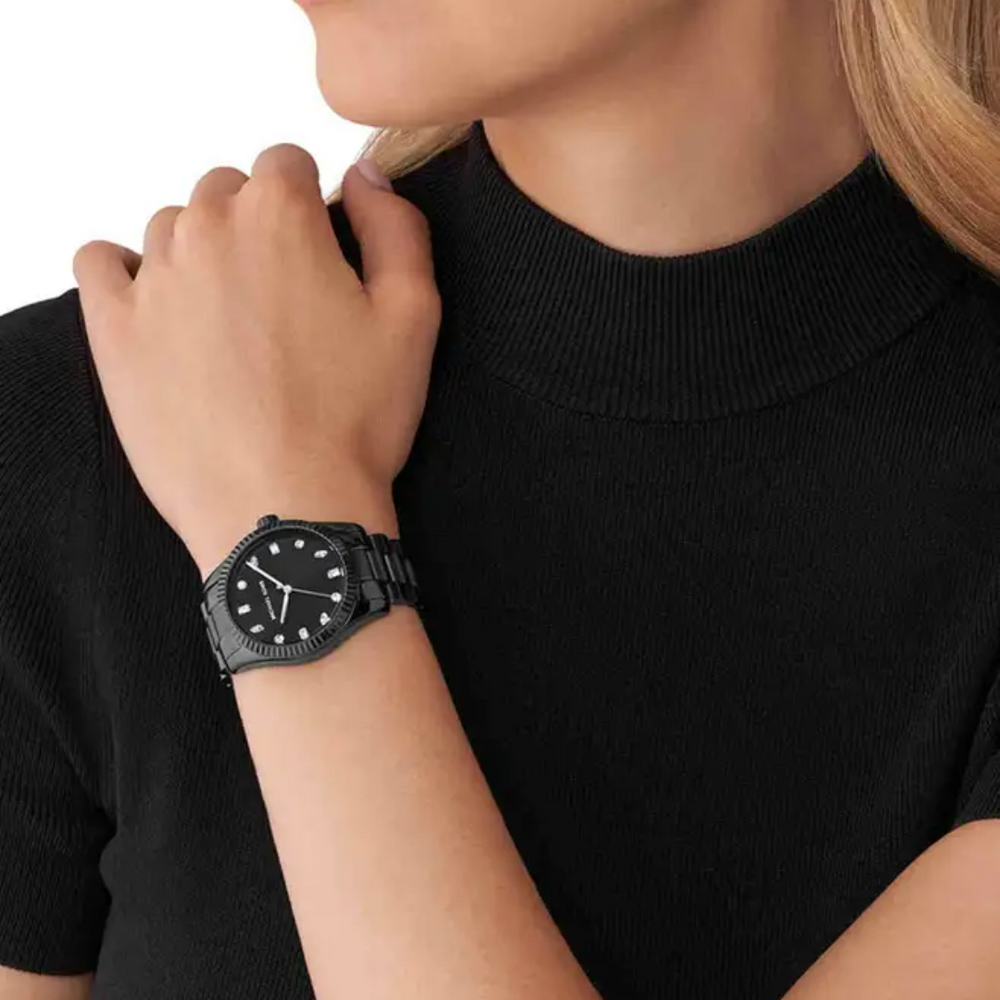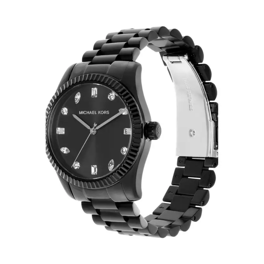 Give your timepiece collection a completion with this women's analog watch from Michael Kors. The black round dial is protected by a mineral glass. It has a crown for time adjustment. The stainless steel strap comes in a black hue that further elevates the look of the timekeeper. Michael Kors' 38mm Lexington watch features a black sunray dial, three-hand movement and black stainless steel bracelet