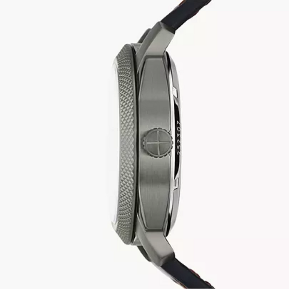 Give a modish look to your wrist by donning this men's analog watch from the Machine collection by Fossil. Encased in a 45 mm case, the grey round-shaped sunray dial is surrounded by mineral glass and features plain 3-hand functionality for time computation. The timepiece runs on an automatic movement. The genuine leather LiteHide strap has a brown hue that upgrades the design of the watch. Furthermore, it is water resistant up to 50 m and is finished with a buckle clasp to ensure a defensible fit on the wrist.