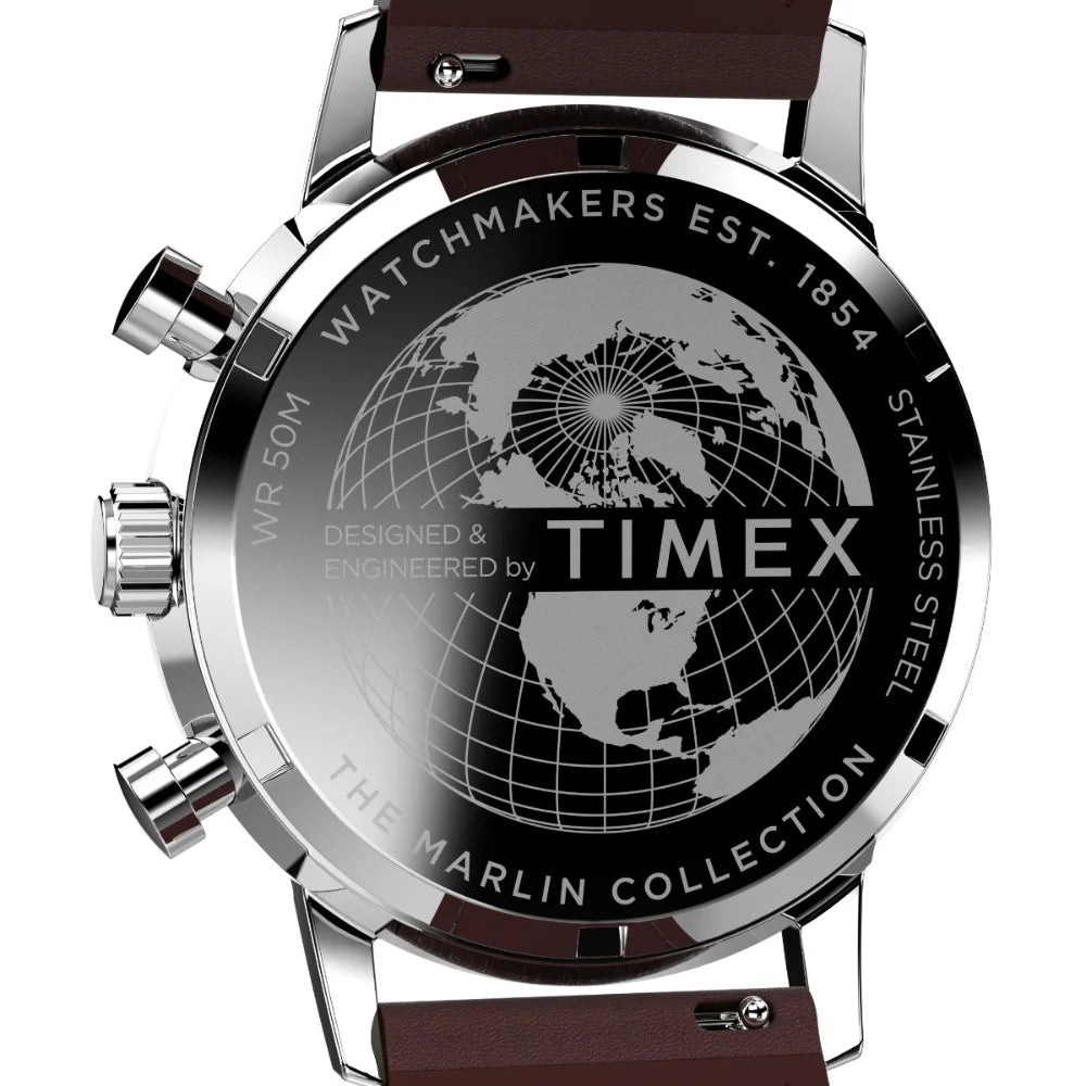 Our Marlin Chronograph Tachymeter boasts the distinction of being the first chronograph in our Marlin line, as well as the first Marlin powered by a quartz movement. This beautifully detailed rendition features a tachymeter index along its outer minute track to measure speed, a unique date window placement, and a perforated natural leather strap. Though its build breaks new ground in our watchmaking heritage, this timepiece retains the classic Marlin features with a sturdy stainless-steel case, domed acrylic crystal lens, and retro-style square markers at 3, 9, and 12 o'clock.
