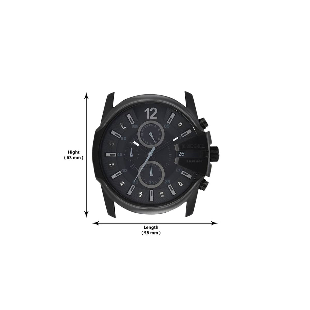 MASTER CHIEF MEN BLACK ANALOG WATCH DZ4180 This men’s Master Chief chronograph watch by Diesel is perfect for the adventure enthusiast in you. This watch boasts of a detail packed black sunray dial is accented with black and silver indexes, a date window, two sub dials along with three crowns on its side. Encased in a solid, round, silver stainless steel case, it is attached to a single link bracelet, fastened around your wrist using a traditional buckle, which makes this watch both sturdy and fashionable.