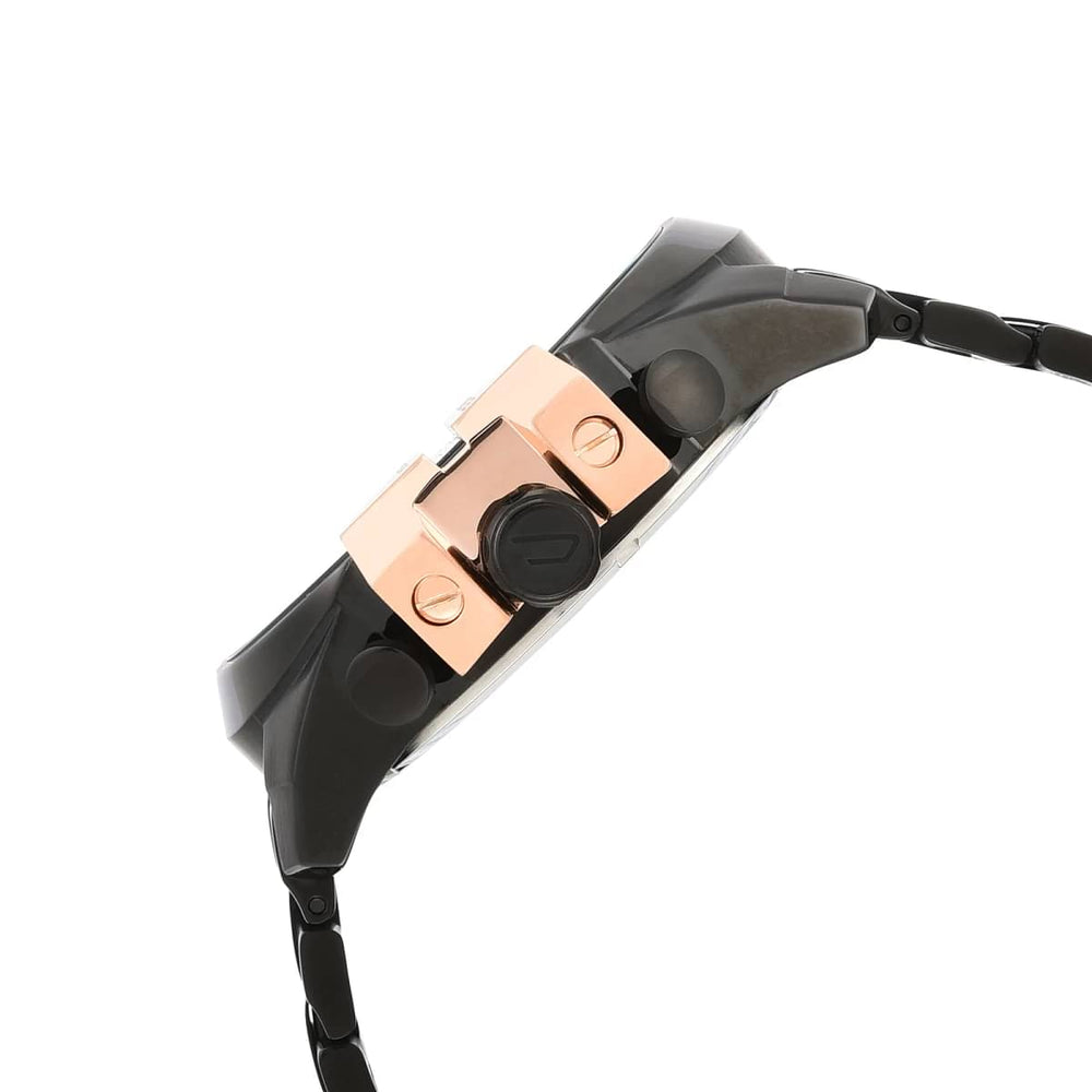 MEGA CHIEF MEN BLACK ANALOG WATCH DZ4309 Rose gold and black can never go wrong, and this Diesel watch for men with a black dial and rose gold hands is a perfect example of it. It is attached to a stainless steel bracelet and enclosed in a stainless steel case that is plated with black ion to perfection. The dial type is analog with a push/pull crown attached to it and could be flaunted with any outfit.