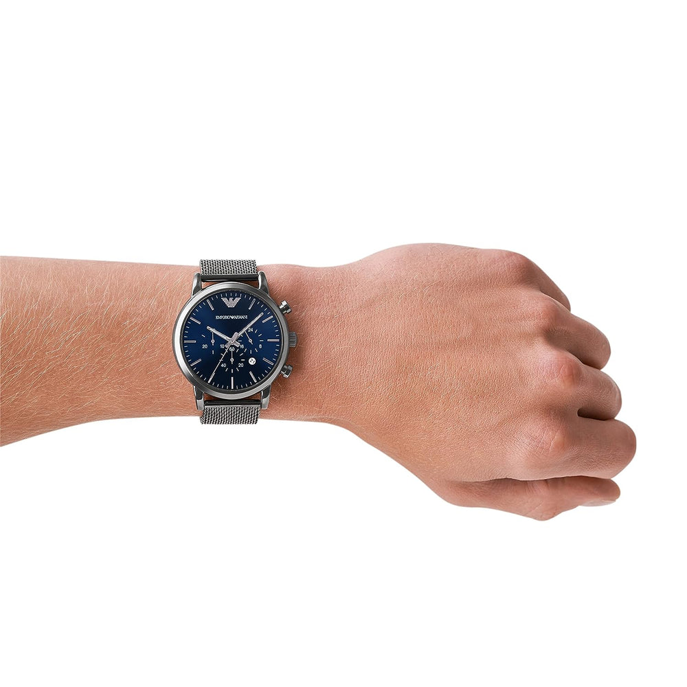 A must-have timepiece for all the watch aficionados, this men analog watch from Emporio Armani will be a perfect pick. Its strap vaunts a gun metal hue that enhances the look of the watch. Housed in a case, the navy round dial is protected by a mineral glass. It showcases chronograph, and a crown for time adjustment. Furthermore, it is complemented with a deployment clasp clasp that ensures a secure fit on the wrist.