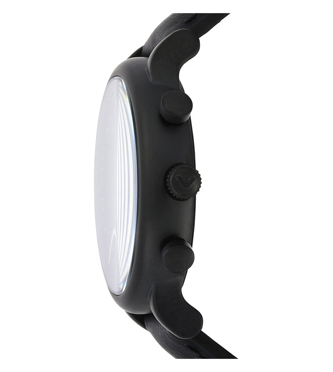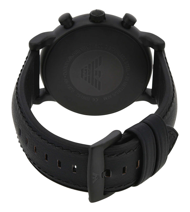 Men's Chronograph Leather Watch AR1970 matte black chronograph dial watch, matte black IP case and silicone-backed black leather strap.