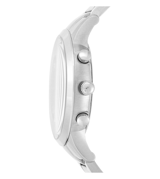 Emporio Armani's 43mm watch features a blue sunray, cd finish dial, chronograph movement and stainless steel bracelet.