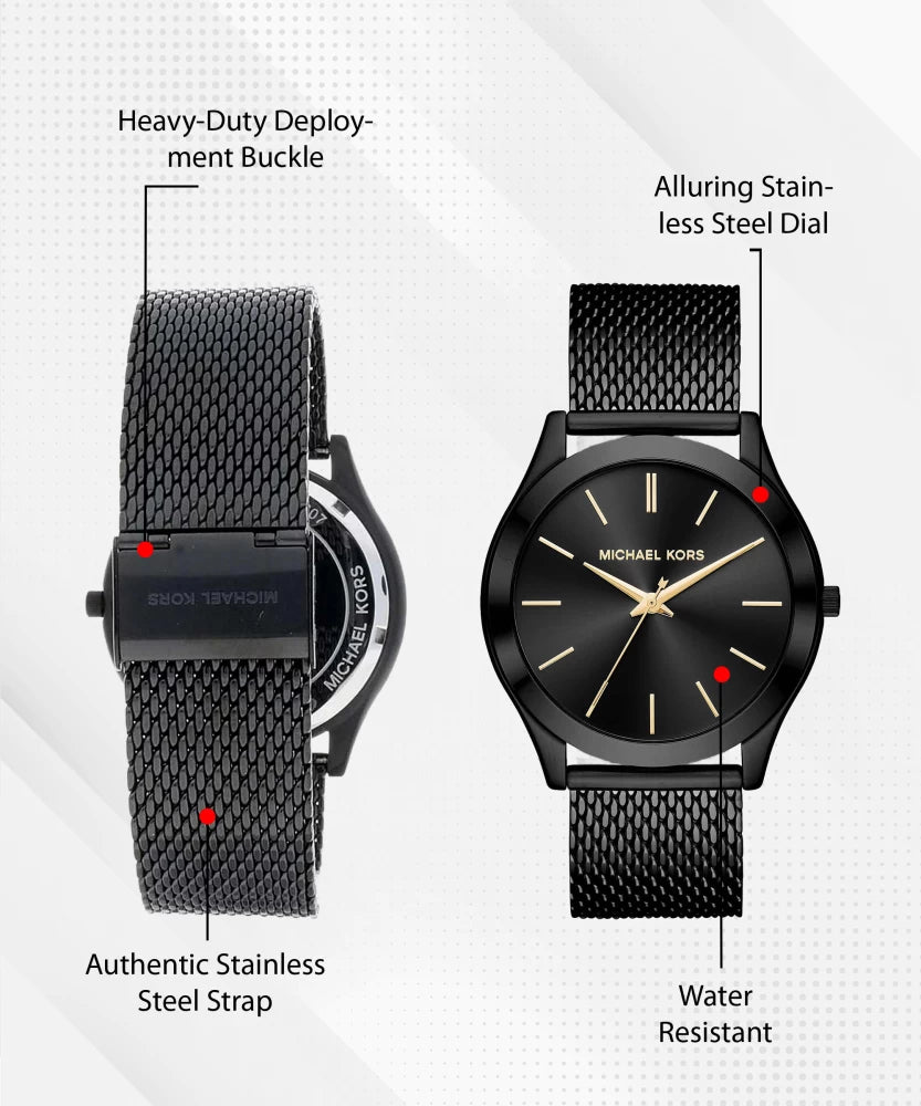 A perennial favorite, this iconic slim Runway men's watch is cast in classy silver-tone stainless steel with a sleek, monochromatic black sunray with gold-tone stick indexes, gold tone hands black IP rounded case and mesh bracelet.