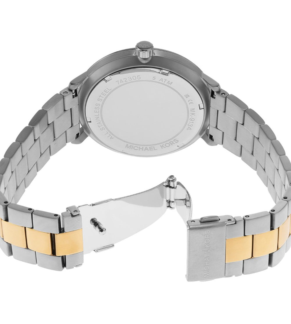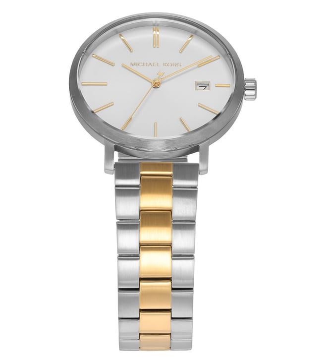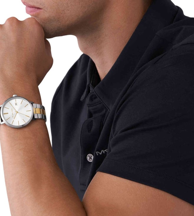 Add a stylish dimension to your look by wearing this men's analog watch from the collection by Michael Kors. The white round dial is protected by a mineral glass. It features a crown for time adjustment. The stainless steel strap comes in a two tone hue that further elevates the look of the timekeeper. Besides, it is completed with a double locking fold-over clasp to ensure a secure fit on the wrist.