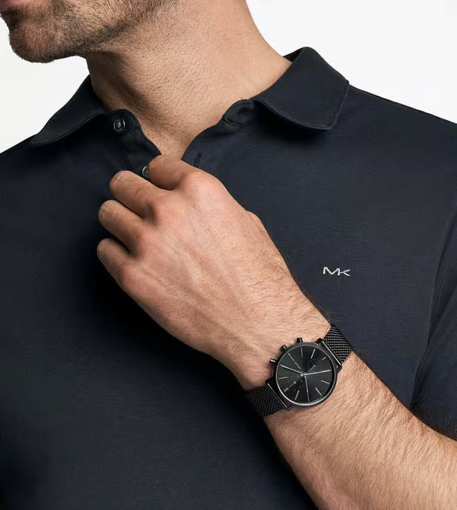 Clean lines and timeless craftsmanship come together to create the Blake watch. This 42mm version features a polished black stainless steel case, a matching dial and mesh bracelet. Powered by a quartz movement and protected by mineral glass, this timepiece embodies a modern, sleek aesthetic with a contemporary twist.