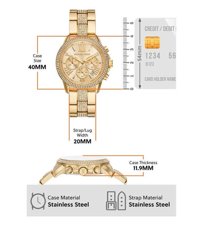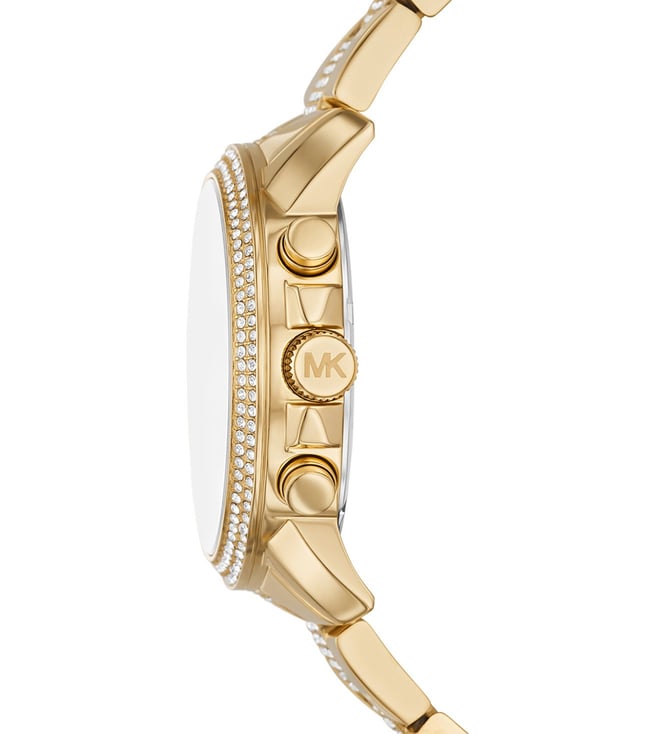 Michael Kors' 40mm Brynn watch features a gold sunray dial, chronograph movement and gold-tone stainless steel bracelet. Amaze everyone around you by wearing this women's analog watch from the collection by Michael Kors. The gold round dial is protected by a mineral glass. It features a crown for time adjustment.