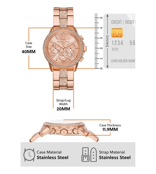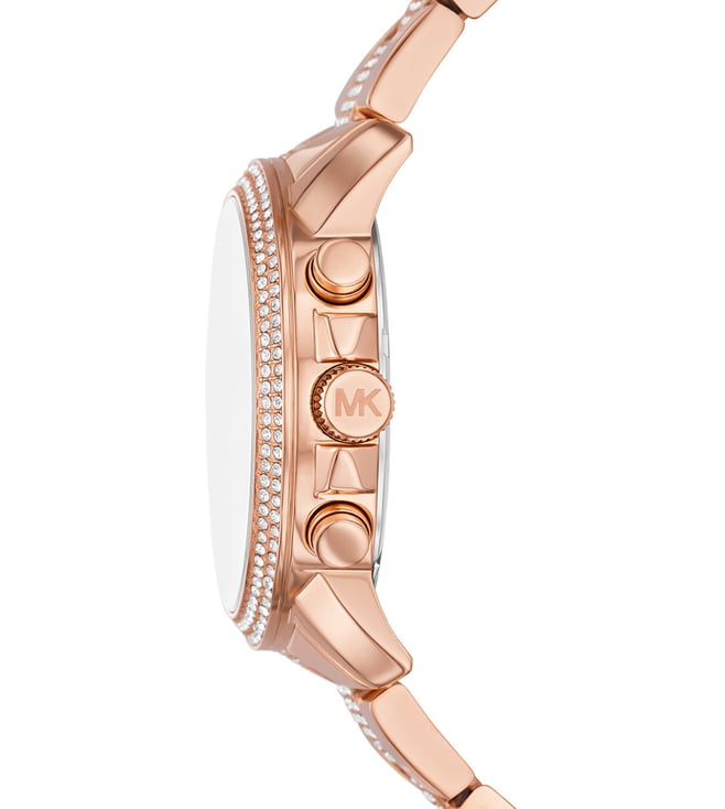 Michael Kors' 40mm Brynn watch features a rose gold sunray dial, chronograph movement and rose gold-tone stainless steel bracelet. Amaze everyone around you by wearing this women's analog watch from the collection by Michael Kors. The rose gold round dial is protected by a mineral glass. It features a crown for time adjustment.