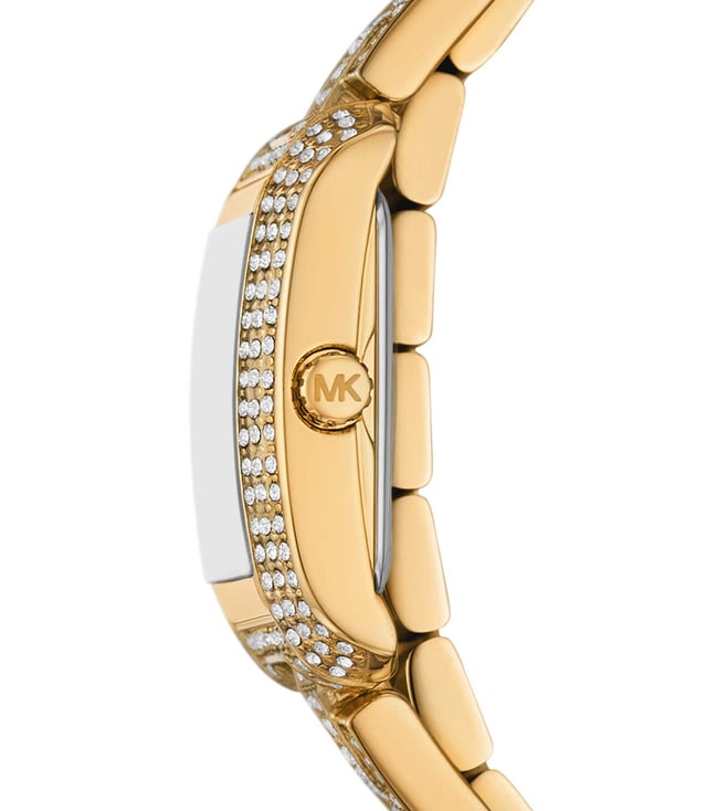 Michael Kors' 22mm Emery watch features a white sunray dial, three-hand movement and gold-tone stainless steel double wrap all over pav¿ bracelet. Amaze everyone around you by wearing this women's analog watch from the collection by Michael Kors. The white rectangular dial is protected by a mineral glass. It features a crown for time adjustment.