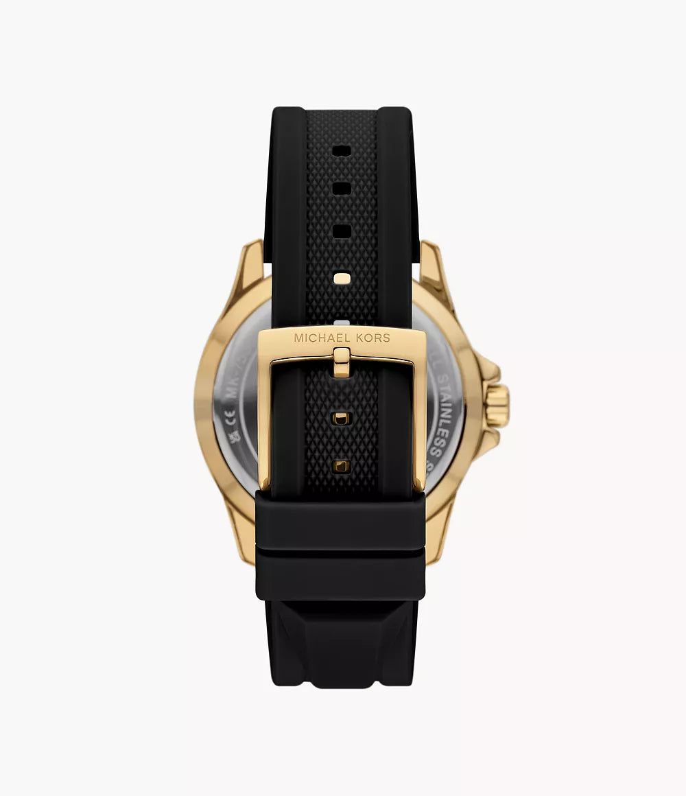 Michael Kors' 40mm iconic Everest watch features a refined black and gold sunray dial, three-hand movement, and a sleek black silicone strap.