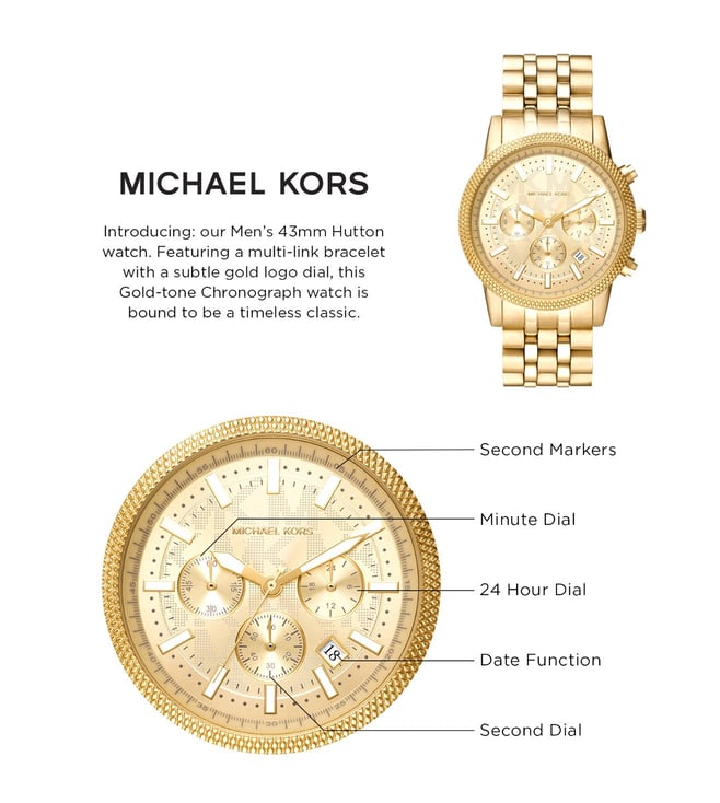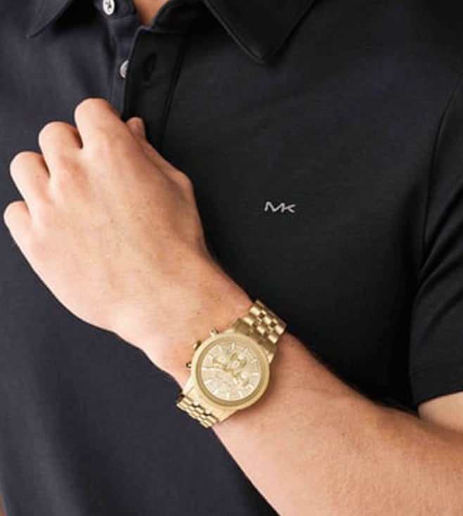 Look modish by donning this men analog watch from Michael Kors. The gold round dial is secured by a mineral glass. It has a crown for time adjustment. The stainless steel strap showcases a gold hue that uplifts the look of the timepiece. Besides, it is finished with a deployment clasp that provides a secure fit on the wrist.
