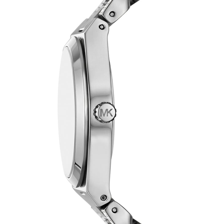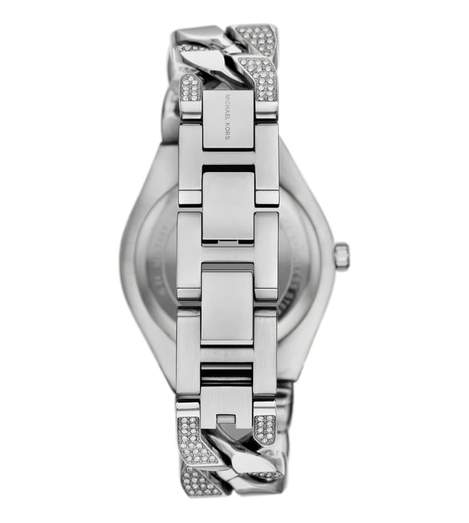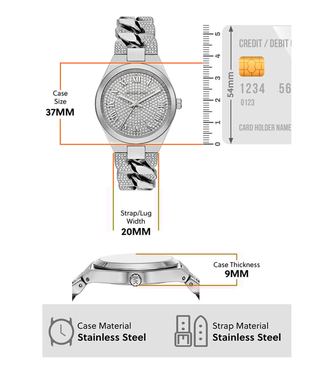 Michael Kors' 37mm Lennox watch features a silver pav¿ dial, three-hand movement and stainless steel curb chain bracelet. Amaze everyone around you by wearing this women's analog watch from the collection by Michael Kors. The silver round dial is protected by a mineral glass. It features a crown for time adjustment.