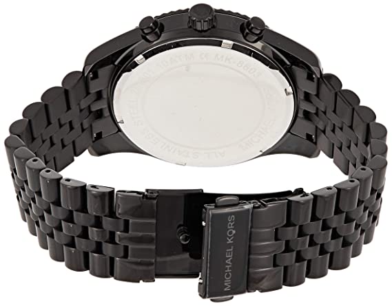 Carry great technology wrapped around your wrist with this stylish men's analog watch from Michael Kors. The black round dial is protected by a mineral glass. This Michael Kors Lexingtone watch features a black sunray chronograph dial with gold-tone indexes, a textured black IP case and is complete with a 5-link black IP bracelet. Besides, it is completed with a fold-over clasp with double push button safety clasp to ensure a secure fit on the wrist.