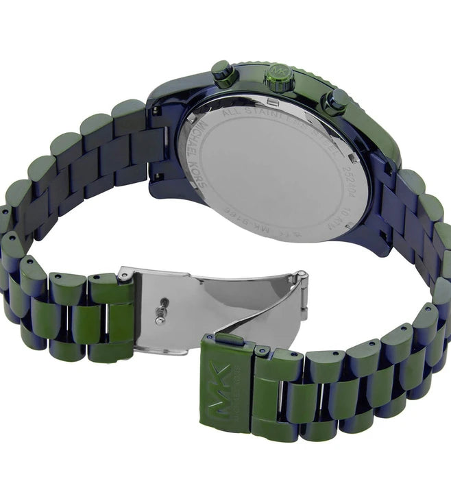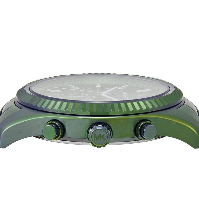 Add a stylish dimension to your look by wearing this men analog watch from Michael Kors. Covered by a mineral glass, the green round dial. It has a crown for time adjustment. The stainless steel strap exudes a green hue that accentuates the look of the timepiece. Moreover, it is fitted with a fold-over clasp with double push button safety clasp that ensures a secure fit on the wrist.