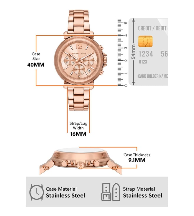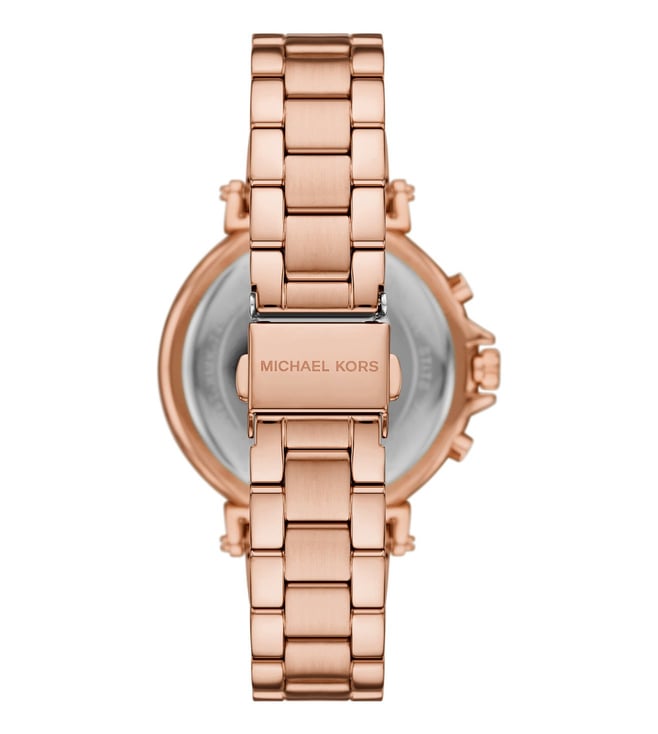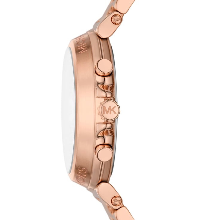 Michael Kors' 40mm Maren watch features a rose gold sunray dial, chronograph movement and rose gold-tone stainless steel bracelet. Amaze everyone around you by wearing this women's analog watch from the collection by Michael Kors. The rose gold round dial is protected by a mineral glass. It features a crown for time adjustment.
