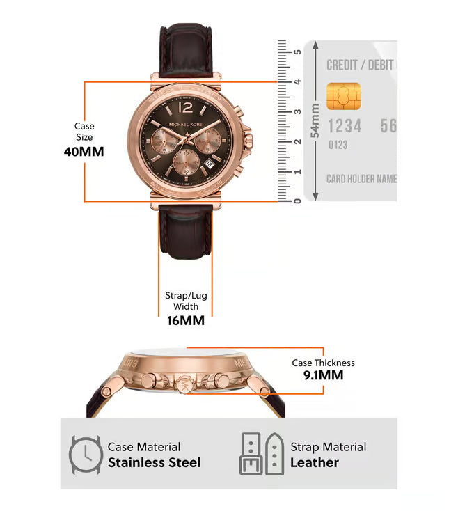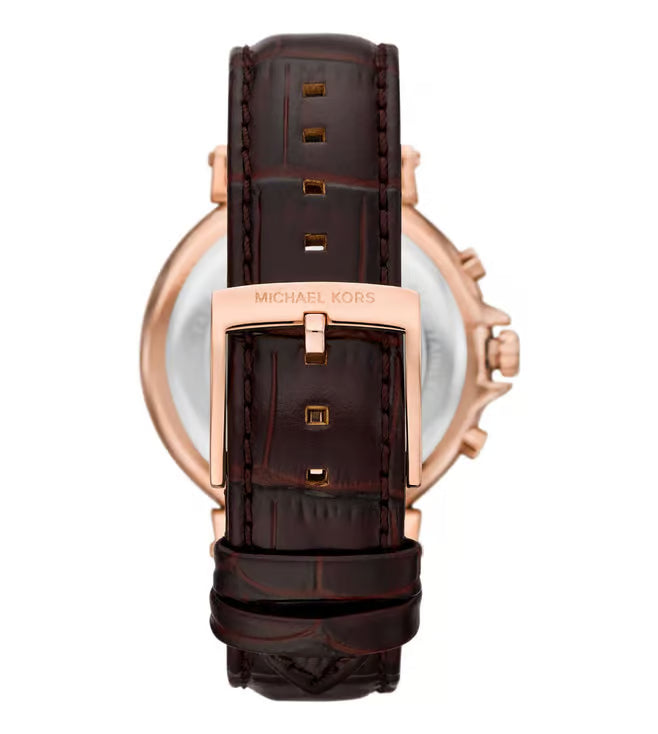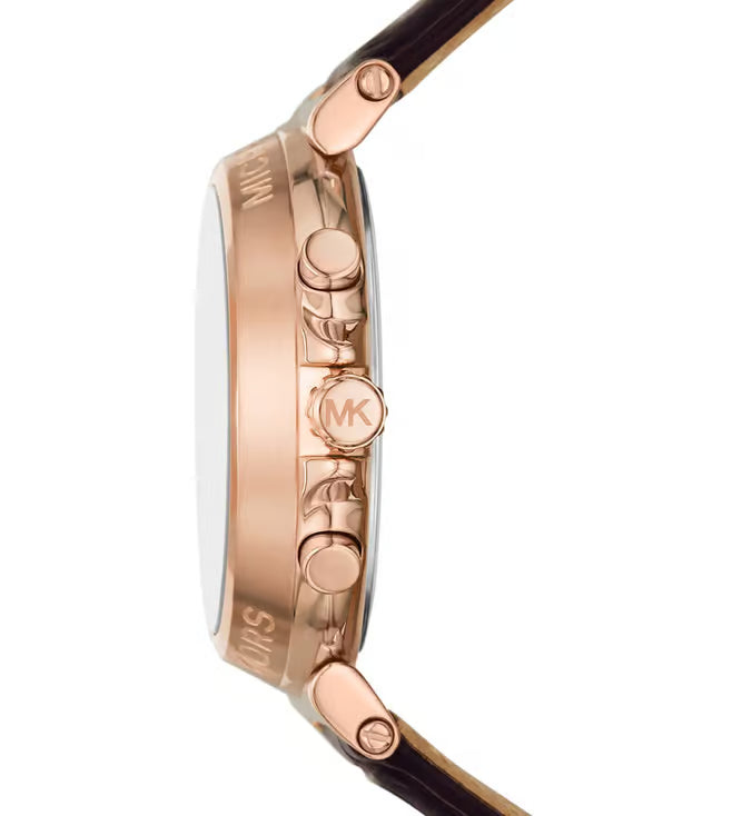 Michael Kors' 40mm Maren watch features a chocolate sunray dial, chronograph movement and a chocolate croco embossed leather strap. Amaze everyone around you by wearing this women's analog watch from the collection by Michael Kors. The brown round dial is protected by a mineral glass. It features a crown for time adjustment.