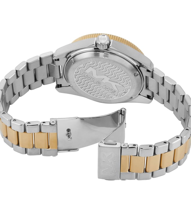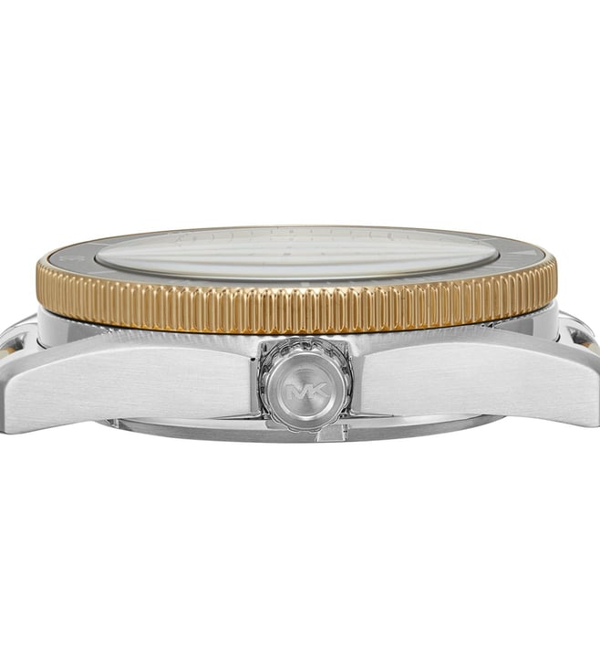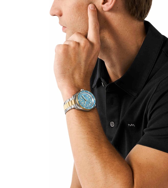 Add a classy touch to your attire by wearing this men analog watch from Michael Kors. the blue round dial is protected by a mineral glass. it has a crown for time adjustment. The stainless steel strap flaunts a two tone hue that accentuates the look of the watch. Besides, it is completed with a fold-over clasp with double push button safety clasp to ensure a secure fit on the wrist.